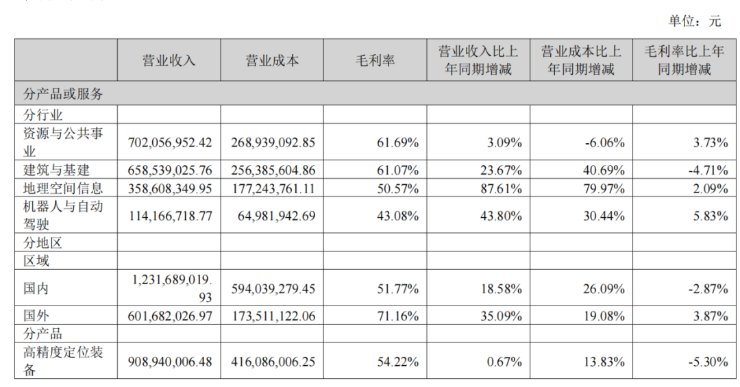毛利率表現(xiàn)方面,“系統(tǒng)應(yīng)用及解決方案”業(yè)務(wù)的毛利率大幅增長61.98%,“高精度定位裝備”業(yè)務(wù)的毛利率從近六成跌至54.2%。