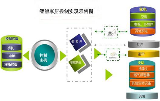 從圖中可以看出,用戶通過操作控制終端實(shí)現(xiàn)家電控制、照明控制、窗簾控制、電話遠(yuǎn)程控制、室內(nèi)外遙控、防盜報(bào)警、環(huán)境監(jiān)測、暖通控制等多種功能。而這些功能都是通過智能家居系統(tǒng)中的核心部件“控制主機(jī)”把家中的各種設(shè)備(如音視頻設(shè)備、照明系統(tǒng)、窗簾控制、空調(diào)控制、安防系統(tǒng)、數(shù)字影院系統(tǒng)、網(wǎng)絡(luò)家電以及三表抄送等)實(shí)現(xiàn)連接并控制的。 |